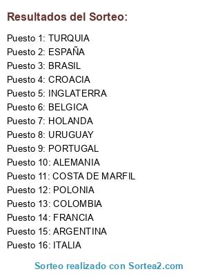 Lista de participantes: COLOMBIA, PORTUGAL, URUGUAY, ESPAÑA, ITALIA, HOLANDA, FRANCIA, ALEMANIA, ARGENTINA, COSTA DE MARFIL, INGLATERRA, BRASIL, BELGICA, POLONIA, CROACIA, TURQUIA.