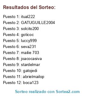 Lista de participantes: abrielmailop, seva231, goticoc, gatojedi, luccy999, stardelmar, GATUGUILLE2004, mailie 703, itual222, joacocasiva, solcito200, boca123.
