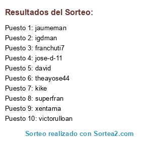 Lista de participantes: jaumeman, theayose44, franchuti7, superfran, victorulloan, kike, jose-d-11, david, igdman, xentama.
