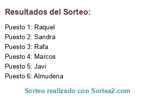 Lista de participantes: Rafa, Raquel, Marcos, Almudena, Sandra, Javi.
