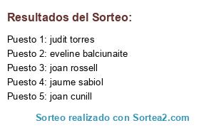 Lista de participantes: lluis soler, carles bonaset, david bohigas, albert junco, jaume sabiol, cristina bramon, eveline balciunaite, judit torres, alex perez, borja prieto, joan cunill, joan rossell, eva sanchez, gemma feixas, elisabet romero.