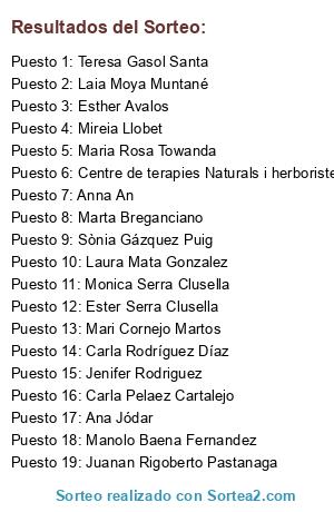 Lista de participantes: Esther Avalos , Teresa Gasol Santa , Mari Cornejo Martos , Manolo Baena Fernandez , Carla Rodríguez Díaz , Ana Jódar , Maria Rosa Towanda , Laura Mata Gonzalez , Ester Serra Clusella , Marta Breganciano , Sònia Gázquez Puig , Jenifer Rodriguez , Laia Moya Muntané , Mireia Llobet , Juanan Rigoberto Pastanaga , Monica Serra Clusella , Anna An , Centre de terapies Naturals i herboristeria Vital S&B , Carla Pelaez Cartalejo.
