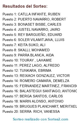 Lista de participantes: ABEIJON TORRALBO, ISABEL, RIBUGENT AGUILAR, PERE F, LLORCA MARULL, DAVID, FAJARDO GALLEGO CASILDA, MONICA, PEREZ PINEDA, MARIA, PIQUE RODRIGUEZ, ANDREA, CASTAÑER IZQUIERDO, JORDI, GOMEZ CHACON, SERGIO, GRAU GIL, ALEIX, SORO SANCHEZ, ROBERT, GUARDIA FUENTES, JUAN CARL, RODRIGUEZ BRONCANO, ALBERTO, BERNABEU CASTELLANOS, MIGUEL ANGEL, GARCIA JABALERA, JAVIER, IGLESIAS GUERRERO, J MARCOS, CABEZAS PEREZ, MOISES, LOPEZ RODRIGUEZ, MIGUEL, CASTELLO MARTI, MIREIA, CANALIAS PEINADO, GEMMA, DE BARNOLA PEREZ, SUSANA, AGUILAR LOPEZ, LAURA, ALARCON PEREZ, JOSE LUIS, BLANCH ROQUETA, JOSE MARIA, XAMPENY AVILES, JOSE MARIA, RAYA BUENO, CRISTOBAL, PORTAS JUAN, JORDI, MERCADER SANGLAS, DAVID, MORA MARRUECOS, ANTONIO, SAKOLLY SINERA, BULLY, JABBI , MUHAMADOU, EL JANATI , MUSTAFA, AZANAY , MOHAMED, CERRO PIÑA, MIQUEL, BAENA GARCIA, ALFONSO, TOURAY , MUHAMADOU, CULLELL PALAU, GUILLEM, PLANAS HERAS, ENRIC, SEBASTIAN PLAZA, OSCAR, VALDERRAMA SALMERON, ENRIQUE, ESCOLA SEGURA, CRISTINA, ESCOLAR CAPEAU, ERIC FRANC, TRUJILLO SALIDO, EUFEMIO, FEIXAS MIR, GEMMA, LAZO ARTAU, JORDI, JUSTEL NAVARRO, JAIRO, PALOMAR VERA, ALICIA, MUÑOZ CASTILLO, JOAQUIM, PETEIRA ANDRES , JAVIER, CASTILLO HERNANDEZ, MªANGELES, ORTEGA GOMEZ, JUAN CARLO, REY GARCIA, JESUS, SOLER BANYERAS, ADRIÀ, SANKARA , MUSA, CAMARA CAMARA, SEIDI, NDIAYE , BOUBOU, AGHDOUM , YOUSSEF, SANCHEZ GARANGER, EVA, SOLER VILAMITJANA, LLUIS, AZANAY TOUZLIN, MOHAMED, SERRA RICH, JORDI, SERRA RICH, VANESSA, KEITA SUKO, ALI, GALCERAN FREIXA, MONTSERRAT, KONTEH, CHUNDI, CAMARA , MUSA, BA, TAFA, HAMMOUCHI , MOHAMED, SALL CAMARA, TOUMANY, COKER NYAME BOAMA, JOSEPH, SINERA , ANSUMANA, LEBRON RUDA, MIGUEL, ALOMA GANDIA, MARTA, ROSSELL SERRAMITJA, JUAN, SANCHEZ VILA, JORDI, BRAMON MORENO, CRISTINA, JUNCO BOIX, ALBERT, SABIOL JUANOLA, JAUME, CAPDEVILA COROMINAS, MARTIN, BALASTEGUI SANTIAGO, ANTONIO, MERCHAN CAÑADA, OSCAR, PEREZ LAGO, ALFREDO, CAPDEVILA VILA, JOAN, BRUNSO GUARDIOLA, CARLES, PUIGVILA ROMERO, MARC, BONASET BISBE, CARLES, ZABSONRE , BOUKARI, TUNKARA , MAHAMADOU, TOURAY , LAHAMIE, TOURAY , ALHAJI DUR, SEVILLANO CANDELAS, PEDRO, COBO LOPERA, CRISTOBAL, DARRAZI SAKALI, AMAR, ROMERO RODRIGUEZ, JUAN JOSE, PALOMINO AGUILERA, JUAN MANUL, FERNANDEZ FONT, ELISABET, XIFRA GARASA, MARTA, BULGHERONI VERGES, YANINA MAR, SOLER GALAN, RAUL, VENTURA CATALA, ARNAU, VENTURA RUBIO, MARTA, SANTANA DE CARLOS, CARLOS, DKIOUAK, EL MOSTAPHA, ORTIZ VELEZ, EDIER DARV, FERRER FAJULA, EDUARDO, HAMMOUCHI, AHMED, ROMERO CHAVEZ, WALTER JAI, DALOUH, MOHAMED, DAMMOU, MUSTAPHA, PEREZ GARCIA, SERGIO, SEY , MUSTAPHA, ZAFRA PULIDO, JOSE LUIS, NDONGO , MAFANDING, BAH, AMADOU, GRAJERA MARTIN, DIEGO, BADIA RODRIGUEZ, DAVID, BOUSNINA, MOHAMMED, ROMERO CAMARA, DEMELZA, SKALLI, MOHAMED, AGOURRAM , MOHAMED, LIAS RODRIGUEZ, RAFAEL, BOUSNINA, RAFIK, MOUANYA SANIDA, MUSTAPHA, SECLISI , MONIR, FOUTA , SAID, CLAROS FERNANDEZ, NORIAN, BRUGUES PLANCHART, MERITXELL, AKHMAISSI, TARIK, RUIZ LARIO, OSCAR, MEDINA BARRERO, DIEGO, TUNKARA, EBRIMA, ANDREOTTI NARDI, JUAN CARLO, BA, BACARY, REIXACH GONZALEZ, VICTOR, LAZARO BELLIDO, JUAN JOSE, BENKHELIFA, BOUABDALLA, KADDOURI, ABDESSELAM, RINA CRUZ, CARLA, SANABRIA ANTEALON, JULIO CESAR, KHALI, BRAHIM, EL MESSARI EL MORABET, MOHAMED SA, SINGH, MALKEET, PEREZ CAMPOS, ALEX, FERRER BALLESTEROS, JOANNA, OUTALHMOUT, MOHA, AGRA RODRIGUEZ, SERGIO, HERRERA NAVEA, ESTER, DOZETOS, MARA TATIA, SERRANO BES, JORGE, JARJU, MODOU LAMI, SISSOKO, MOUSSA, MUÑOZ NAVA BENALAQUES, JORDI, MARTINEZ LUQUE RAFAEL, TOURAY, MUHAMADOU, BARRO, SOULEYMANE, AZNAR CLOSAS, OLGA, JORQUERA CEDEÑO, RAQUEL, PEREZ ECIJA, RAUL, CATLLA INFANTE, RUBEN, FERNANDEZ MARTINEZ, FRANCISCO, GARCIA AMADOR, FRANCISCO, GOMEZ ROCA, JOSE LUIS, MARTIN GUTIERREZ, LUIS ALBERTO, JUDIDIAS BLANCH, LUIS, REY CENTELLES, JUAN, REY BARGUEÑO, EDUARD, MORENO JIMENEZ, NICOLAS, MARTINEZ GUTIERREZ, MARIANO, CEBRIAN COSTA, JESUS, PARRA LLORCA, RICARD, PEINADO PULIDO, ALBERT, ESTELLER LLIDO, ALEX, CHAM, MUSA, RUIZ RODRIGUEZ, ERIC, SUAREZ VALLE, ELOY, MAGRO PANADERO, MANUEL, PUERTO NAVARRO, ROBERT, BERGA SANTOS, CARLOS, VILLAVICENCIO PILLA, GINGER ALI, VILCHEZ FERNANDEZ,FRANCISCO, SANKAREH SANKAREH, SEGU, KRUBALLY CAMARA, ABUDOULAHE, PERERA LOPEZ, JONATAN, ALFARO ALFARO, DAVID, HAMMOUCHI, SAID, VYZHANOV, OLEKSANDR, ZERIOUH , HAFID, MORENO LOPEZ, ISABEL, LATORRE GOMEZ, JESUS, GOMEZ JIMENEZ, ALEJANDRO, PEREZ OBREGON, OSCAR ACAZ, SOTOCA CARRILLO, ISMAEL, MORALES OLIVERA, VERONICA, RAMIREZ LAO, ALDUARA, EL GARAH, YOUNESS, EL GARRAB, ALI, LANGA TUBAU, RUT, ACEDO ACEDO, RAFAELA, BAOUAR BAOUAR, RACHID, CARBALLO CARRE, MARIA, SERRAT MASLLORENS, MARIA, PARRA BLANCA, AIDA, BECERRA, JACKSON, CARRERA MARTINEZ, ERIC, LOPEZ RUIZ, CRISTIAN, CARRERA AGUSTI, PERE, NICOLAS FONT, JOAN, GUERRAB, NOUREDDINE, EL DEHIZA, HASSAN, GONZALEZ GONZALEZ, FELIPE, GARCIA ALCARAZ, SANDRA, BELTRAN QUINTANA, SERGIO, ESPINO CECILIA, RAFAEL, CARRERAS JUANA,PERE, AMINE TORO, SARA, LOPEZ SILVA, SILVIA, DÈBIA FERNANDEZ, EUGENI, ZOUAE, ABDUSALAM, LOPEZ TORRENT, ANNA MARIA, BELTRAN MORENO, MIGUEL, TORRES PLANAS, JUDIT, EL MRINI BENSAR, YOUSSEF, SIMON CAPELL, JOSEP, JAITEH , MARIAMU, GELABERT BOADA, MARTI, MORGADO GONZALEZ, SERGIO, TAIBI, MUSTAPHA, BOUZA GHNAN, MOHAMED, ACUÑA ZAMBRANO, ARMANDO, MARIN ALONSO, ANTONIO, ROJAS PONCE, MACEDONIO, RUIZ MAYORGAS, M CARMEN.