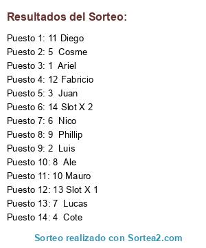 Lista de participantes: 1 Ariel, 2 Luis, 3 Juan, 4 Cote, 5 Cosme, 6 Nico, 7 Lucas, 8 Ale, 9 Phillip, 10 Mauro, 11 Diego, 12 Fabricio, 13 Slot X 1, 14 Slot X 2.