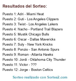 Lista de participantes: Oscar - Dallas Mavericks, Roman - Atlanta Hawks, Jordi - Oklahoma City Thunder, Jorge - Boston Celtics, Suly - New York Knicks, Guti - Los Angeles Clippers, Adri - Miami Heat, Ponzio - San Antonio Spurs, Mustik Chicago Bulls, Twist - Los Angeles Lakers, Nacho - Portland Trail Blazers, Victor - ???.