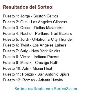 Lista de participantes: Oscar - Dallas Mavericks, Roman - Atlanta Hawks, Jordi - Oklahoma City Thunder, Jorge - Boston Celtics, Suly - New York Knicks, Guti - Los Angeles Clippers, Adri - Miami Heat, Ponzio - San Antonio Spurs, Mustik - Chicago Bulls, Twist - Los Angeles Lakers, Nacho - Portland Trail Blazers, Victor - Indiana Pacers.