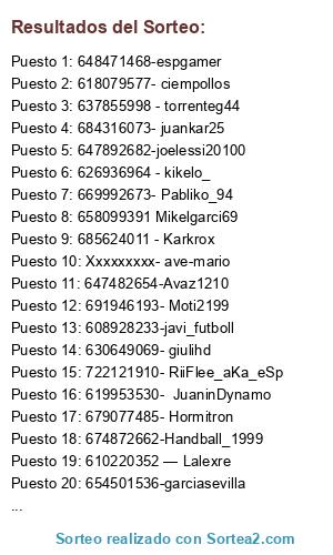 Lista de participantes: 722121910- RiiFlee_aKa_eSp, 647482654-Avaz1210, 652811329-MrErlantz, 658099391 Mikelgarci69, 674872662-Handball_1999, 654980109-Josegm14, 679077485- Hormitron, 685624011 - Karkrox, 619953530- JuaninDynamo, 691946193- Moti2199, 685271806- Sergi15491, 608928233-javi_futboll, 610220352 — Lalexre, 689389568-lumocre, 678513581- jorgefrm95, 647892682-joelessi20100, 697595626-cr96_dlc, 637855998 - torrenteg44, 654501536-garciasevilla, 648471468-espgamer, 626936964 - kikelo_, 618079577- ciempollos, 649640462- david190490, 669992673- Pabliko_94, 636142028-CarlosDM14, 654437696- ruben gn, 684316073- juankar25, 630649069- giulihd, Xxxxxxxxx- ave-mario.