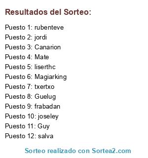 Lista de participantes: rubenteve, jordi, salva, Guy, Mate, Magiarking, Guelug, txertxo, liserthc, joseley, frabadan, Canarion.