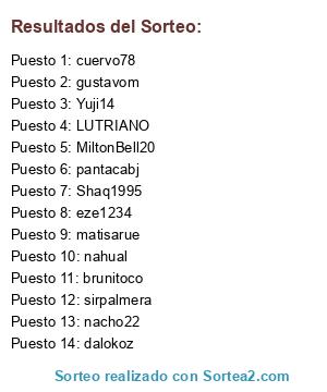 Lista de participantes: brunitoco, LUTRIANO, cuervo78, eze1234, Yuji14, sirpalmera, nacho22, pantacabj, Shaq1995, gustavom, matisarue, dalokoz, nahual, MiltonBell20.
