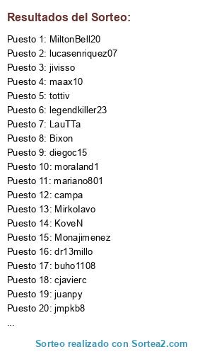 Lista de participantes: Bixon, buho1108, campa, centella, chapacba, cjavierc, cristinorodrigo, diegoc15, dr13millo, fryson, jivisso, jmpkb8, juanpy, KoveN, LauTTa, legendkiller23, lucasenriquez07, lucho0108, maax10, mariano801, Matyas, MiltonBell20, MirkoIavo, Monajimenez, moraland1, niko73, punkguy, Razinger, SebaCentral, tottiv.