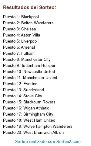 Lista de participantes: Arsenal, Aston Villa, Birmingham City, Blackburn Rovers, Blackpool, Bolton Wanderers, Chelsea, Everton, Fulham, Liverpool, Manchester City, Manchester United, Newcastle United, Stoke City, Sunderland, Tottenham Hotspur, West Bromwich Albion, West Ham United, Wigan Athletic, Wolverhampton Wanderers.