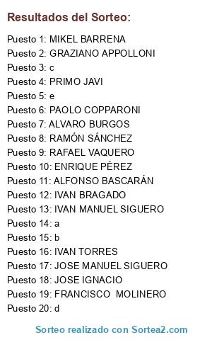 Lista de participantes: GRAZIANO APPOLLONI, PAOLO COPPARONI, ALFONSO BASCARÁN, RAMÓN SÁNCHEZ, JOSE MANUEL SIGUERO, MIKEL BARRENA, FRANCISCO MOLINERO, PRIMO JAVI, JOSE IGNACIO, IVAN MANUEL SIGUERO, RAFAEL VAQUERO, ENRIQUE PÉREZ, IVAN TORRES, IVAN BRAGADO, ALVARO BURGOS, a, b, c, d, e.