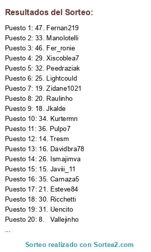 Lista de participantes: 8. Vallejinho, 9. Excelsior, 10. Furri, 11. Ra_ul, 12. Pipoxarli, 13. Crisaneco, 14. Tresm, 15. Javiii_11, 16. Davidbra78, 17. Lykaios22, 18. Jkalde, 19. Zidane1021, 20. Raulinho, 21. Esteve84, 22. Matito, 23. Asu-11, 24. Antoninho10, 25. Lightcould, 26. Ismajimva, 27. Gonperilla, 28. Javinoval, 29. Xiscoblea7, 30. Ricchetti, 31. Uencito, 32. Peedraziak, 33. Manolotelli, 34. Kurtermn, 35. Carnaza5, 36. Pulpo7, 37. Cule_1993, 38. Garza__76, 39. Cuervo, 40. Paramo, 41. Xampa, 42. Victorochoa, 43. Jonan, 44. Ivanpirlo, 45. Snorlaxveraniego, 46. Fer_ronie, 47. Fernan219, 48. Jzone.