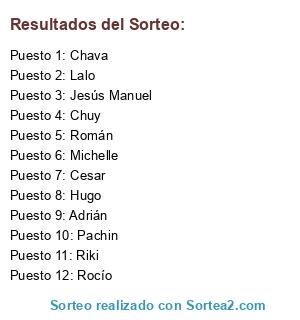 Lista de participantes: Pachin, Román, Riki, Michelle, Lalo, Adrián, Rocío, Hugo, Cesar, Chuy, Chava, Jesús Manuel.