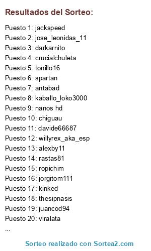 Lista de participantes: alexby11, willyrex_aka_esp, chiguau, chiguau1, outconsumer, dioderone, jose_leonidas_11, tonillo16, lunha, j19101997, ropichim, mreasteregg, messi10, jackspeed, thesipnasis, juancod94, kaballo_loko3000, nanos hd, darkarnito, rastas81, davide66687, viralata, antabad, arcangel0692, spartan, alvaronake, kinked, jorgitom111, crucialchuleta.