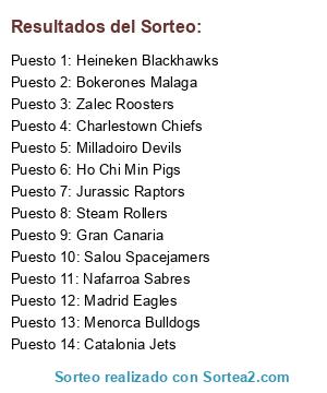 Lista de participantes: Catalonia Jets (10), Steam Rollers (20), Salou Spacejamers (30), Jurassic Raptors (40), Menorca Bulldogs (50), Gran Canaria (60), Madrid Eagles (70), Ho Chi Min Pigs (80), Heineken Blackhawks (90), Bokerones Malaga (100), Milladoiro Devils (125), Nafarroa Sabres (150), Zalec Roosters (200), Charlestown Chiefs (250).