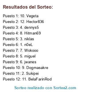 Lista de participantes: 1. n0eL, 2. Sukipei, 3. niklas, 4. dennys5, 5. miguel, 6. jwanes, 7. Wokooo, 8. Hitman69, 9. Dogmasakre, 10. Vegeta, 11. BelaFarinRod, 12. Hector836.