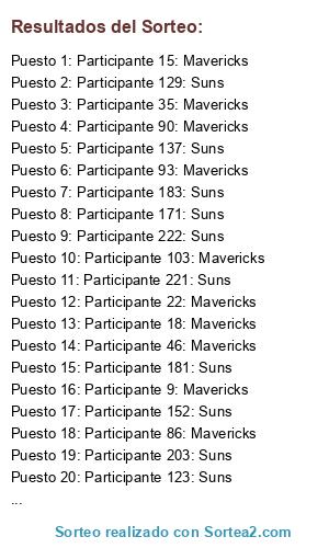 Lista de participantes: Participante 1: Mavericks, Participante 2: Mavericks, Participante 3: Mavericks, Participante 4: Mavericks, Participante 5: Mavericks, Participante 6: Mavericks, Participante 7: Mavericks, Participante 8: Mavericks, Participante 9: Mavericks, Participante 10: Mavericks, Participante 11: Mavericks, Participante 12: Mavericks, Participante 13: Mavericks, Participante 14: Mavericks, Participante 15: Mavericks, Participante 16: Mavericks, Participante 17: Mavericks, Participante 18: Mavericks, Participante 19: Mavericks, Participante 20: Mavericks, Participante 21: Mavericks, Participante 22: Mavericks, Participante 23: Mavericks, Participante 24: Mavericks, Participante 25: Mavericks, Participante 26: Mavericks, Participante 27: Mavericks, Participante 28: Mavericks, Participante 29: Mavericks, Participante 30: Mavericks, Participante 31: Mavericks, Participante 32: Mavericks, Participante 33: Mavericks, Participante 34: Mavericks, Participante 35: Mavericks, Participante 36: Mavericks, Participante 37: Mavericks, Participante 38: Mavericks, Participante 39: Mavericks, Participante 40: Mavericks, Participante 41: Mavericks, Participante 42: Mavericks, Participante 43: Mavericks, Participante 44: Mavericks, Participante 45: Mavericks, Participante 46: Mavericks, Participante 47: Mavericks, Participante 48: Mavericks, Participante 49: Mavericks, Participante 50: Mavericks, Participante 51: Mavericks, Participante 52: Mavericks, Participante 53: Mavericks, Participante 54: Mavericks, Participante 55: Mavericks, Participante 56: Mavericks, Participante 57: Mavericks, Participante 58: Mavericks, Participante 59: Mavericks, Participante 60: Mavericks, Participante 61: Mavericks, Participante 62: Mavericks, Participante 63: Mavericks, Participante 64: Mavericks, Participante 65: Mavericks, Participante 66: Mavericks, Participante 67: Mavericks, Participante 68: Mavericks, Participante 69: Mavericks, Participante 70: Mavericks, Participante 71: Mavericks, Participante 72: Mavericks, Participante 73: Mavericks, Participante 74: Mavericks, Participante 75: Mavericks, Participante 76: Mavericks, Participante 77: Mavericks, Participante 78: Mavericks, Participante 79: Mavericks, Participante 80: Mavericks, Participante 81: Mavericks, Participante 82: Mavericks, Participante 83: Mavericks, Participante 84: Mavericks, Participante 85: Mavericks, Participante 86: Mavericks, Participante 87: Mavericks, Participante 88: Mavericks, Participante 89: Mavericks, Participante 90: Mavericks, Participante 91: Mavericks, Participante 92: Mavericks, Participante 93: Mavericks, Participante 94: Mavericks, Participante 95: Mavericks, Participante 96: Mavericks, Participante 97: Mavericks, Participante 98: Mavericks, Participante 99: Mavericks, Participante 100: Mavericks, Participante 101: Mavericks, Participante 102: Mavericks, Participante 103: Mavericks, Participante 104: Mavericks, Participante 105: Mavericks, Participante 106: Mavericks, Participante 107: Mavericks, Participante 108: Mavericks, Participante 109: Mavericks, Participante 110: Mavericks, Participante 111: Mavericks, Participante 112: Mavericks, Participante 113: Mavericks, Participante 114: Mavericks, Participante 115: Mavericks, Participante 116: Suns, Participante 117: Suns, Participante 118: Suns, Participante 119: Suns, Participante 120: Suns, Participante 121: Suns, Participante 122: Suns, Participante 123: Suns, Participante 124: Suns, Participante 125: Suns, Participante 126: Suns, Participante 127: Suns, Participante 128: Suns, Participante 129: Suns, Participante 130: Suns, Participante 131: Suns, Participante 132: Suns, Participante 133: Suns, Participante 134: Suns, Participante 135: Suns, Participante 136: Suns, Participante 137: Suns, Participante 138: Suns, Participante 139: Suns, Participante 140: Suns, Participante 141: Suns, Participante 142: Suns, Participante 143: Suns, Participante 144: Suns, Participante 145: Suns, Participante 146: Suns, Participante 147: Suns, Participante 148: Suns, Participante 149: Suns, Participante 150: Suns, Participante 151: Suns, Participante 152: Suns, Participante 153: Suns, Participante 154: Suns, Participante 155: Suns, Participante 156: Suns, Participante 157: Suns, Participante 158: Suns, Participante 159: Suns, Participante 160: Suns, Participante 161: Suns, Participante 162: Suns, Participante 163: Suns, Participante 164: Suns, Participante 165: Suns, Participante 166: Suns, Participante 167: Suns, Participante 168: Suns, Participante 169: Suns, Participante 170: Suns, Participante 171: Suns, Participante 172: Suns, Participante 173: Suns, Participante 174: Suns, Participante 175: Suns, Participante 176: Suns, Participante 177: Suns, Participante 178: Suns, Participante 179: Suns, Participante 180: Suns, Participante 181: Suns, Participante 182: Suns, Participante 183: Suns, Participante 184: Suns, Participante 185: Suns, Participante 186: Suns, Participante 187: Suns, Participante 188: Suns, Participante 189: Suns, Participante 190: Suns, Participante 191: Suns, Participante 192: Suns, Participante 193: Suns, Participante 194: Suns, Participante 195: Suns, Participante 196: Suns, Participante 197: Suns, Participante 198: Suns, Participante 199: Suns, Participante 200: Suns, Participante 201: Suns, Participante 202: Suns, Participante 203: Suns, Participante 204: Suns, Participante 205: Suns, Participante 206: Suns, Participante 207: Suns, Participante 208: Suns, Participante 209: Suns, Participante 210: Suns, Participante 211: Suns, Participante 212: Suns, Participante 213: Suns, Participante 214: Suns, Participante 215: Suns, Participante 216: Suns, Participante 217: Suns, Participante 218: Suns, Participante 219: Suns, Participante 220: Suns, Participante 221: Suns, Participante 222: Suns, Participante 223: Suns, Participante 224: Suns, Participante 225: Suns, Participante 226: Suns, Participante 227: Suns.