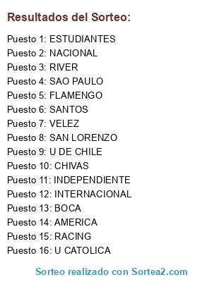 Lista de participantes: FLAMENGO, VELEZ, SAN LORENZO, BOCA, NACIONAL, AMERICA, ESTUDIANTES, INDEPENDIENTE, CHIVAS, U DE CHILE, INTERNACIONAL, SANTOS, RACING, RIVER, U CATOLICA, SAO PAULO.