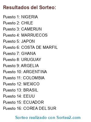 Lista de participantes: CAMERUN, COSTA DE MARFIL, NIGERIA, GHANA, BRASIL, MEXICO, CHILE, COLOMBIA, URUGUAY, ARGENTINA, MARRUECOS, ECUADOR, JAPON, COREA DEL SUR, ARGELIA, EEUU.