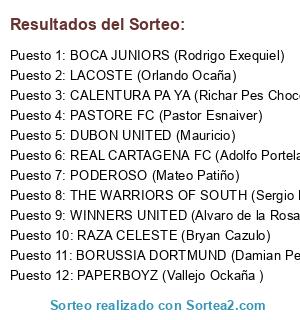 Lista de participantes: THE WARRIORS OF SOUTH (Sergio Ruiz), PASTORE FC (Pastor Esnaiver), PODEROSO (Mateo Patiño), BORUSSIA DORTMUND (Damian Perea), REAL CARTAGENA FC (Adolfo Portela), CALENTURA PA YA (Richar Pes Choco), RAZA CELESTE (Bryan Cazulo), PAPERBOYZ (Vallejo Ockaña ), LACOSTE (Orlando Ocaña), WINNERS UNITED (Alvaro de la Rosa), DUBON UNITED (Mauricio), BOCA JUNIORS (Rodrigo Exequiel).