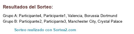 Lista de participantes: Valencia, Borussia Dortmund, Manchester City, Crystal Palace, Participante1, Participante2, Participante3, Participante4.
