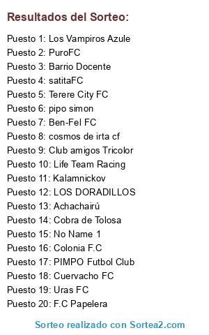 Lista de participantes: LOS DORADILLOS, Life Team Racing, PuroFC, Kalamnickov, cosmos de irta cf, Cuervacho FC, Club amigos Tricolor, Colonia F.C, No Name 1, Terere City FC, satitaFC, F.C Papelera, Uras FC, Achachairú, Barrio Docente, PIMPO Futbol Club, Cobra de Tolosa, Ben-Fel FC, pipo simon, Los Vampiros Azule.