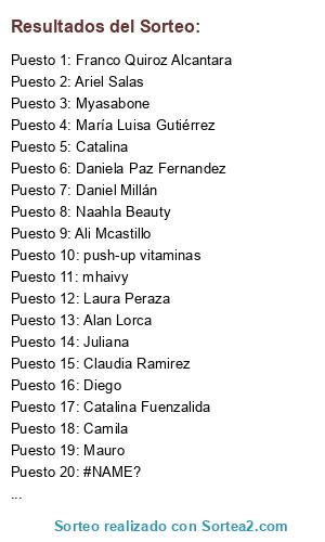 Lista de participantes: push-up vitaminas, Kender Yemtzain Contreras Parada, José Ignacio Vega, Myasabone, Catalina Fuenzalida, David Mauricio molina, Naahla Beauty, mhaivy, Juliana, yenny, Elizabeth Pasten, Ariel Salas, Mauro, Anthony Iván Paredes Rodríguez, Joselyn Jiménez, gabriela paz, Benlli Ibacache Ortiz, María José Vásquez Gómez, Josefa Barra, Santos RS, Diego, María Luisa Gutiérrez, Daniela Paz Fernandez, veganfoodchile, Ali Mcastillo, Laura Peraza, Joaquín, Sebastian Del Campo, #NAME?, Raúl Ignacio Lillo Pérez, stefano, Alex Brillembourg, Camila, Ángel Rivillo, Franco Quiroz Alcantara, Elias Fuentes, Alan Lorca, Constanza Pavez Solis, Rodolfo Stazzi, Claudia Ramirez, Berni Urzua, Felipe Sandoval, Catalina, Andrea, Daniel Millán, Carla Meyer.
