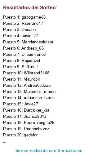Lista de participantes: sayin_27, Rserrano17, adriancho_barce, Mauropi1, Shenko7748, Juanca9313, juanka1907, Decano, sebas-0713, Javle27, Pty_507_panama, Stiflerstif, Melendez_marco, Andresp_66, Vasco1208, Sebasp_0311, Pedro_rengifo25, Adonkodim, gedelor, Crifab, gabogame88, Unoriochavez, fabianzionnoiz, Wilbrand3108, Pandora_xD, Andree03daza, Darckiker_kra, Marcianoeskrlata, El buen once, Rojodavid, Albirroto, Davalty, Achiras, Riskbreak12.