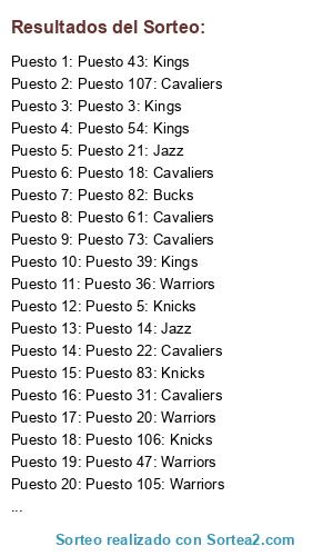 Lista de participantes: Puesto 1: Cavaliers, Puesto 2: Bucks, Puesto 3: Kings, Puesto 4: Cavaliers, Puesto 5: Knicks, Puesto 6: Warriors, Puesto 7: Cavaliers, Puesto 8: Knicks, Puesto 9: Jazz, Puesto 10: Warriors, Puesto 11: Bucks, Puesto 12: Cavaliers, Puesto 13: Jazz, Puesto 14: Jazz, Puesto 15: Cavaliers, Puesto 16: Warriors, Puesto 17: Jazz, Puesto 18: Cavaliers, Puesto 19: Warriors, Puesto 20: Warriors, Puesto 21: Jazz, Puesto 22: Cavaliers, Puesto 23: Cavaliers, Puesto 24: Kings, Puesto 25: Warriors, Puesto 26: Kings, Puesto 27: Warriors, Puesto 28: Warriors, Puesto 29: Jazz, Puesto 30: Jazz, Puesto 31: Cavaliers, Puesto 32: Warriors, Puesto 33: Cavaliers, Puesto 34: Cavaliers, Puesto 35: Knicks, Puesto 36: Warriors, Puesto 37: Cavaliers, Puesto 38: Kings, Puesto 39: Kings, Puesto 40: Kings, Puesto 41: Warriors, Puesto 42: Cavaliers, Puesto 43: Kings, Puesto 44: Warriors, Puesto 45: Warriors, Puesto 46: Jazz, Puesto 47: Warriors, Puesto 48: Kings, Puesto 49: Knicks, Puesto 50: Cavaliers, Puesto 51: Bucks, Puesto 52: Bucks, Puesto 53: Cavaliers, Puesto 54: Kings, Puesto 55: Jazz, Puesto 56: Kings, Puesto 57: Bucks, Puesto 58: Jazz, Puesto 59: Bucks, Puesto 60: Cavaliers, Puesto 61: Cavaliers, Puesto 62: Kings, Puesto 63: Bucks, Puesto 64: Knicks, Puesto 65: Knicks, Puesto 66: Warriors, Puesto 67: Warriors, Puesto 68: Warriors, Puesto 69: Bucks, Puesto 70: Cavaliers, Puesto 71: Kings, Puesto 72: Knicks, Puesto 73: Cavaliers, Puesto 74: Knicks, Puesto 75: Kings, Puesto 76: Bucks, Puesto 77: Cavaliers, Puesto 78: Jazz, Puesto 79: Jazz, Puesto 80: Jazz, Puesto 81: Kings, Puesto 82: Bucks, Puesto 83: Knicks, Puesto 84: Jazz, Puesto 85: Bucks, Puesto 86: Knicks, Puesto 87: Kings, Puesto 88: Warriors, Puesto 89: Cavaliers, Puesto 90: Kings, Puesto 91: Warriors, Puesto 92: Cavaliers, Puesto 93: Jazz, Puesto 94: Cavaliers, Puesto 95: Cavaliers, Puesto 96: Bucks, Puesto 97: Knicks, Puesto 98: Cavaliers, Puesto 99: Bucks, Puesto 100: Knicks, Puesto 101: Warriors, Puesto 102: Cavaliers, Puesto 103: Kings, Puesto 104: Warriors, Puesto 105: Warriors, Puesto 106: Knicks, Puesto 107: Cavaliers, Puesto 108: Knicks, Puesto 109: Warriors, Puesto 110: Kings, Puesto 111: Jazz, Puesto 112: Bucks, Puesto 113: Bucks, Puesto 114: Cavaliers, Puesto 115: Warriors, Puesto 116: Kings, Puesto 117: Knicks, Puesto 118: Bucks, Puesto 119: Bucks.