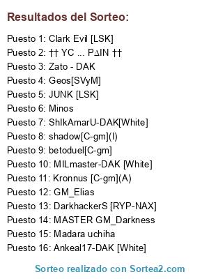 Lista de participantes: Kronnus [C-gm](A), shadow[C-gm](I), †† YC ... P∆IN ††, Minos, MILmaster-DAK [White], Ankeal17-DAK [White], JUNK [LSK], Geos[SVyM], GM_Elias, Madara uchiha, ShIkAmarU-DAK[White], DarkhackerS [RYP-NAX], MASTER GM_Darkness, Clark Evil [LSK], Zato - DAK, betoduel[C-gm].