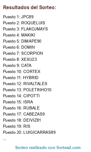 Lista de participantes: MESCAMILLA, RUBEN_94, SEFIROTTT, FLAKOJMAYS, AYTOR96, LUIGICARRAS89, CIPOTTI, RICHISANFER, JPC89, MAKIKI, IRU, JUANDY, ZEQUI, DOMIN, CABEZAS9, RUBALE, POLETINHO10, CORTEX, ROQUELUIS, PEDRITO HOSPI, CATA, ISRA, SCORPION, DEIVIZ81, ASSALITO, MISTIAN11, RIVALTALES, HYBRID, XEXU23, JCARLINHO19, DIMAPE90, RIS.