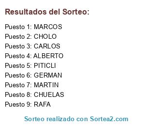 Lista de participantes: RAFA, CARLOS, MARTIN, MARCOS, CHUELAS, CHOLO, ALBERTO, GERMAN, PITICLI.