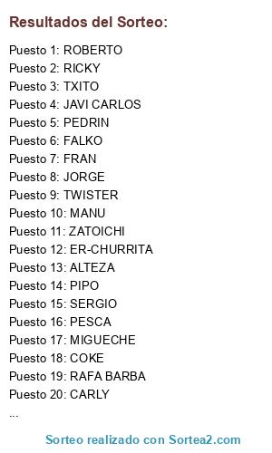 Lista de participantes: ALTEZA, JORGE, MANU, TWISTER, ZATOICHI, MIGUECHE, CARLY, BOGARDE, JAVY, COKE, RICKY, FALKO, TXITO, MAGETO, ER-CHURRITA, RAFA BARBA, SERGIO, PEDRIN, FRAN, KELO, PESCA, PIPO, JAVI CARLOS, ROBERTO.