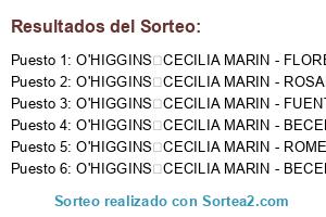 Lista de participantes: O'HIGGINS CECILIA MARIN - FUENTEALBA REVECO ANA KATHERINE (22), O'HIGGINS CECILIA MARIN - ROMERO SOTO CATALINA PAZ (16), O'HIGGINS CECILIA MARIN - FLORES ORELLANA JESENIA FRANCISCA (12), O'HIGGINS CECILIA MARIN - BECERRA ZAMORANO DANIELA SOFIA (9), O'HIGGINS CECILIA MARIN - ROSALES ROSALES JOSELLIN YISSELLA (8), O'HIGGINS CECILIA MARIN - FIGUEROA TORRES KATHERINE NICOLE (7), O'HIGGINS CECILIA MARIN - BECERRA SAGREDO JOSE FABIAN ESTEBAN (6), O'HIGGINS CECILIA MARIN - FERNANDEZ LIZAMA YASNA DE LA LUZ (4), O'HIGGINS CECILIA MARIN - VERGARA DIAZ PRISCILLA ANDREA (4), O'HIGGINS CECILIA MARIN - PEÑA CORDOVA KATERINA DEL CARMEN (3), O'HIGGINS CECILIA MARIN - LAURENT ROJAS NINOSKA SOLANGE (3), O'HIGGINS CECILIA MARIN - IBARRA PINTO CINDY VALESCA (2), O'HIGGINS CECILIA MARIN - CHAVARRIA ROMERO BARBARA CONSTANZA (2), O'HIGGINS CECILIA MARIN - SILVA VEJAR JENIFER ANDREA (1), O'HIGGINS CECILIA MARIN - FORMANDOY FIGUEROA SHARON FRANCISCA (1).