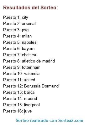 Lista de participantes: madrid, barça, borusia, bayern, atletico, city, manchester united, arsenal, juve, milan, tottenham, psg, napoles, chelsea, liverpool, valencia.
