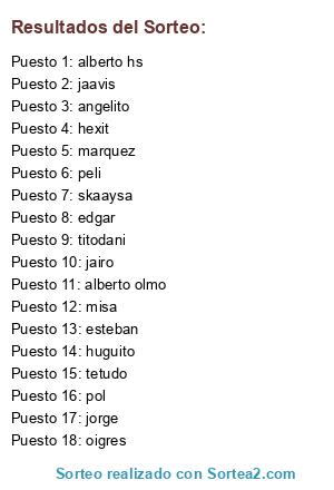 Lista de participantes: edgar, peli, alberto hs, pol, alberto olmo, esteban, titodani, tetudo, misa, skaaysa, oigres, marquez, huguito, jorge, jairo, jaavis, angelito, hexit.