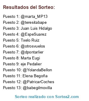 Lista de participantes: Txelo Ruiz, Marta Eugi, eje Pedalier, Elena Begoña, Juan Luis Hidalgo, @dpontarlier, @YolandaBellon, @EspeSuarez, @teresitabape, @PatricarCoches, @marta_MP13, @otrosvuelos, @babegilmovilla.