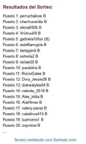 Lista de participantes: gabriela10fun (B), Anethvero B, Vrichuu09 B, AlaiHines B, zab32 B, taeilor B, Lolarokera4 B, zoyreina B, luzmomo1 B , ostrelia2 B , catalinus415 B , paulaliria B, zafirogatubela B, perruchalove B , valery-perez B , VICKYBALDI B, PrincesaLorenit B , glind B, dianastyles04 B, Emely4849 B , Diva_Jessie38 B, celeste_0516 B, Starlight124 B, ositas55 B, phergie…. B , betsypink B, chechucecilia B, karlianysuper B, Alex_lolita B, elena0505 B, famosaaares B, RocioGales B, DivaTaylor-9 B, Cecilia.59 B, Sabdi_Galindo B, Lolalaamorosa3 B , Bridgitmend1er B, Joanitha2 B, esteffannypie B.