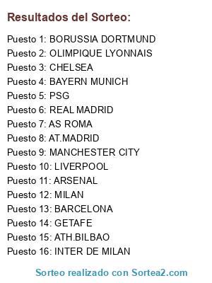 Lista de participantes: INTER DE MILAN, BARCELONA, ARSENAL, LIVERPOOL, MANCHESTER CITY, ATH.BILBAO, MILAN, BAYERN MUNICH, GETAFE, AS ROMA, PSG, OLIMPIQUE LYONNAIS, REAL MADRID, BORUSSIA DORTMUND, CHELSEA, AT.MADRID.