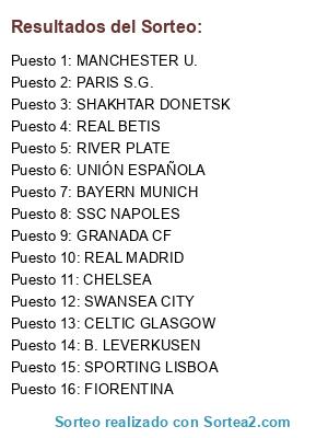 Lista de participantes: MANCHESTER U., B. LEVERKUSEN, SHAKHTAR DONETSK, PARIS S.G., GRANADA CF, BAYERN MUNICH, CHELSEA, UNIÓN ESPAÑOLA, REAL BETIS, RIVER PLATE, REAL MADRID, SWANSEA CITY, FIORENTINA, SPORTING LISBOA, CELTIC GLASGOW, SSC NAPOLES.