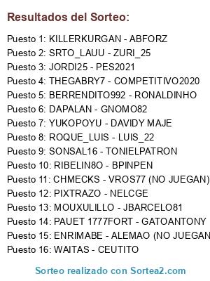 Lista de participantes: RIBELIN8O - BPINPEN, ENRIMABE - ALEMAO (NO JUEGAN), YUKOPOYU - DAVIDY MAJE, PAUET 1777FORT - GATOANTONY, SRTO_LAUU - ZURI_25, SONSAL16 - TONIELPATRON, CHMECKS - VROS77 (NO JUEGAN), JORDI25 - PES2021, PIXTRAZO - NELCGE, THEGABRY7 - COMPETITIVO2020, WAITAS - CEUTITO, KILLERKURGAN - ABFORZ, BERRENDITO992 - RONALDINHO, MOUXULILLO - JBARCELO81, DAPALAN - GNOMO82, ROQUE_LUIS - LUIS_22.