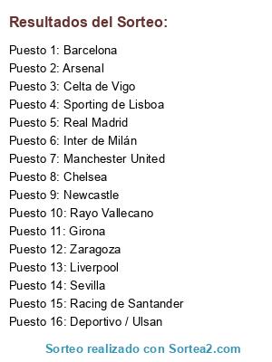 Lista de participantes: Liverpool, Real Madrid, Sporting de Lisboa, Racing de Santander, Inter de Milán, Celta de Vigo, Manchester United, Barcelona, Zaragoza, Girona, Arsenal, Chelsea, Newcastle, Sevilla, Rayo Vallecano, Deportivo / Ulsan.