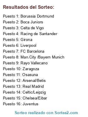 Lista de participantes: Arsenal/Betis, Chelsea/Eibar, Osasuna, Real Madrid, Man.City /Bayern Munich, Borussia Dortmund, Girona, Celtic/Leipzig, Juventus, Zaragoza, Rayo Vallecano, Boca Juniors, FC Barcelona, Racing de Santander, Liverpool, Celta de Vigo.