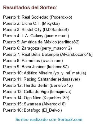 Lista de participantes: Bristol City (DJ2SantooS), Atlético Mineiro (yo_y_mi_matuja), Botafogo (El_Deivol), Racing Santander (edusasver), Zaragoza (perry_mason12), Real Sociedad (Poderoxxo), Elche C.F. (Mikykko), Boca Juniors (luchooo87), Real Betis Balompié (AlvaroLozano15), Celta de Vigo (Ismajimva), Ogn Nice (Kiquebcn_89), Swansea (Alvaroox16), Hertha Berlín (Beneivol12), L.A. Galaxy (jaume-marti), Palmeiras (crachizam), América de México (carlittos82).