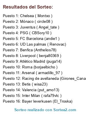 Lista de participantes: Racing de avellaneda (Girones_Canarios ), PSG ( CBSory10 ), Liverpool ( benja80369 ), Juventus ( Angel_tate ), UD Las palmas ( Renovac), Valencia (put_amo13), Betis ( wisa23), Inter Milan ( rafa79vlc ), FC Barcelona (andie1 ), Arsenal ( armadillo_97 ), Roma (borjaelbicho ), Benfica (Anthelios78), Chelsea ( Montxo ), Atlético Madrid (puga14), Bayer leverkusen (El_Troska), Mónaco ( circle08 ).