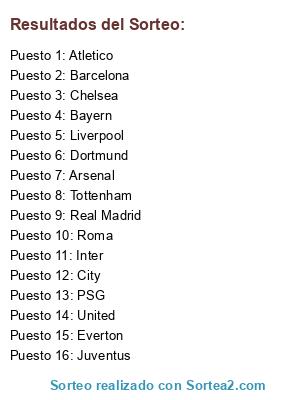 Lista de participantes: PSG, Juventus, Liverpool, Arsenal, Barcelona, Dortmund, Inter, City, Bayern, Chelsea, United, Tottenham, Roma, Real Madrid, Everton, Atletico.