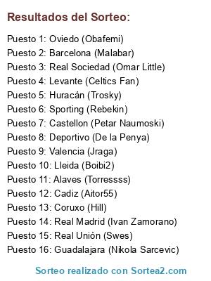 Lista de participantes: Coruxo (Hill), Huracán (Trosky), Real Sociedad (Omar Little), Valencia (Jraga), Sporting (Rebekin), Alaves (Torressss), Real Unión (Swes), Guadalajara (Nikola Sarcevic), Castellon (Petar Naumoski), Oviedo (Obafemi), Real Madrid (Ivan Zamorano), Lleida (Boibi2), Barcelona (Malabar), Deportivo (De la Penya), Levante (Celtics Fan), Cadiz (Aitor55).