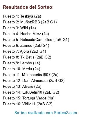 Lista de participantes: EduBetis10 (2aB G2), Teskiya (2a), Ajora (2aB G1), BeticodeCampillos (2aB G1), Nacho Mtez (1a), Lembo (1a), Zamue (2aB G1), Alvaro (2a), Wild (1a), Dani Almenara (2aB G2), Medu (2a), Tk Betis (2aB G2), Mushobetis1907 (2a), Vitillo11 (2aB G2), MuñozRBB (2aB G1), Tortuga Verde (1a).