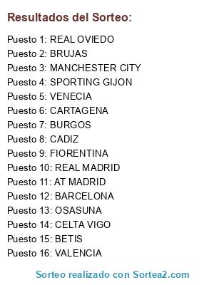 Lista de participantes: SPORTING GIJON, BURGOS, VENECIA, BRUJAS, VALENCIA, FIORENTINA, CELTA VIGO, AT MADRID, OSASUNA, REAL MADRID, MANCHESTER CITY, CARTAGENA, BARCELONA, BETIS, REAL OVIEDO, CADIZ.